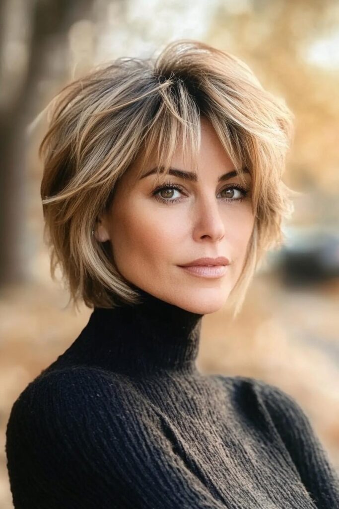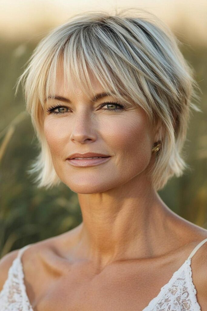 She wears a stylish, layered bob haircut with gentle, textured bangs. Her hair color is blonde with lighter highlights, giving it a fresh and current appearance that looks like it’s been kissed by the sun.