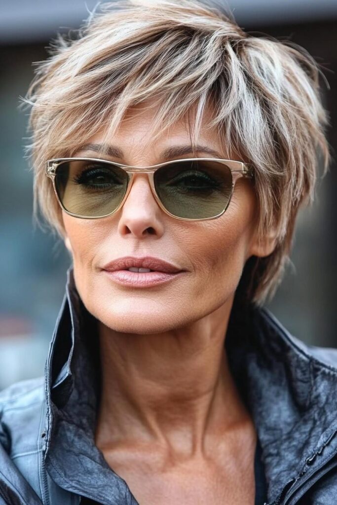She has a short pixie haircut with layers and texture. The bangs are cut in a choppy style, giving her hair a fresh and trendy look.